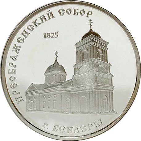Description: The Cathedral of the Transfiguration in Bendery, built in 1825. Cyrillic inscriptions encircle the image: "ПРЕОБРАЖЕНСКИЙ СОБОР" at the top and "БЕНДЕРЫ" at the bottom.