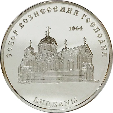 Description: Cathedral of the Ascension in Kitskany. "1864" is above the image. Cyrillic inscriptions encircle the top ("Cathedral of the Ascension") and bottom ("Kitskany").