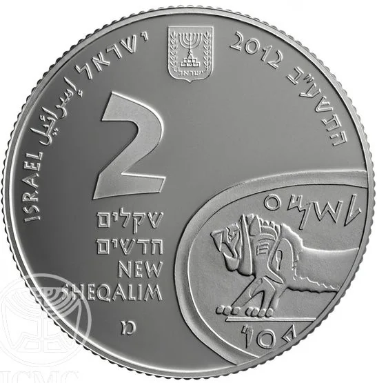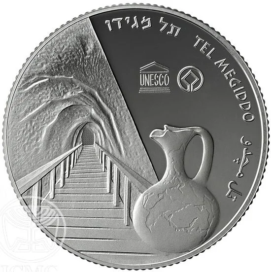 "Israel" in English, Hebrew, and Arabic; mint year; State Emblem; and segment of an 8th-century BCE seal from Megiddo.