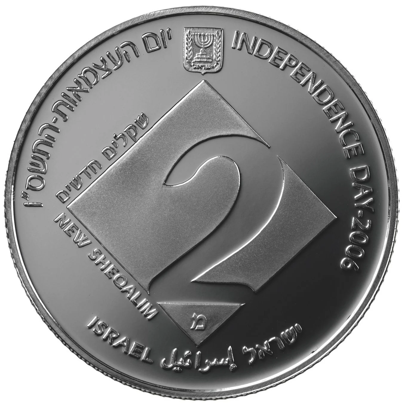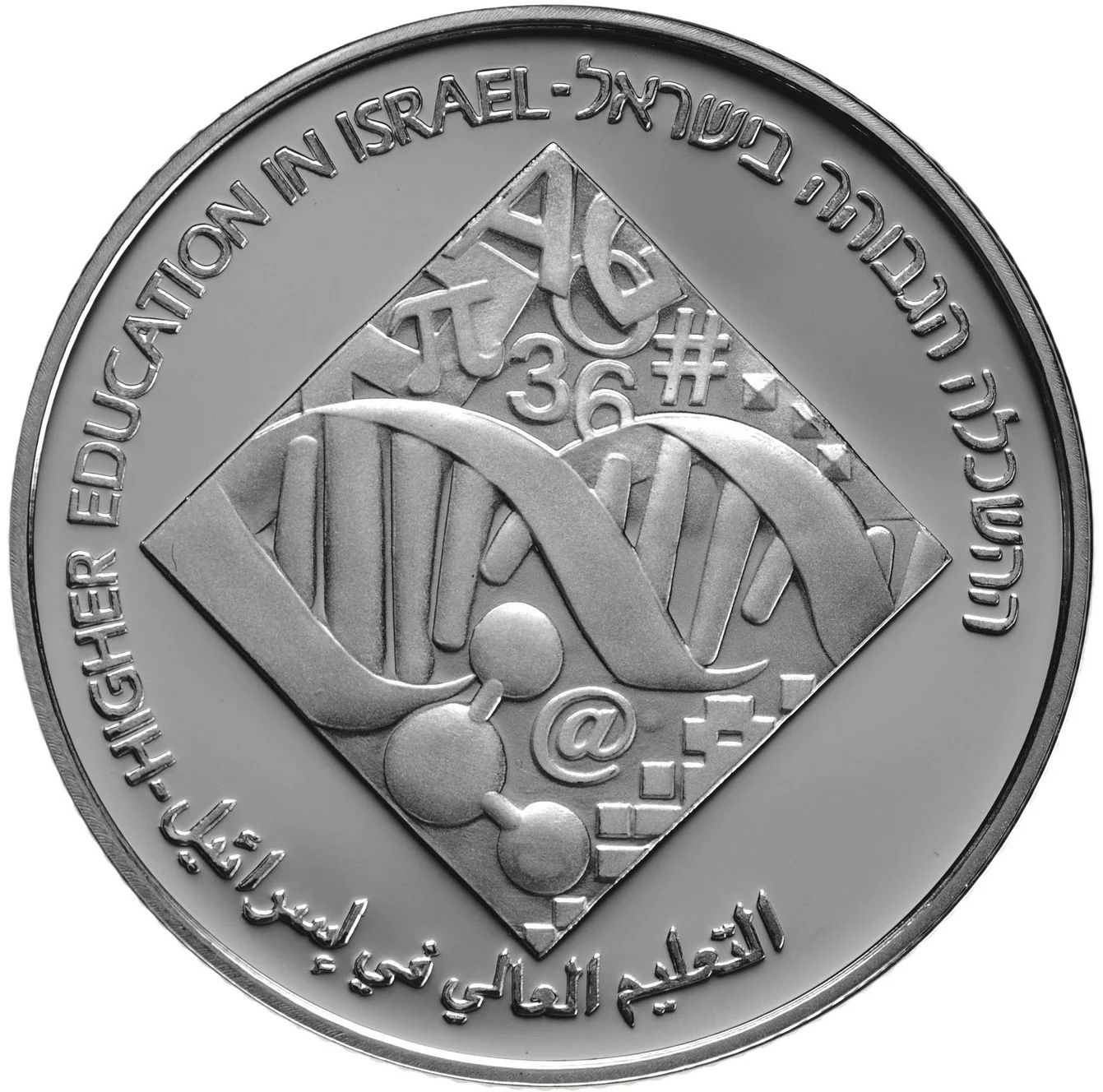 The coin features symbols from various academic disciplines combined into a world shaped like a graduation cap. The border reads "HIGHER EDUCATION IN ISRAEL" in Hebrew and English.