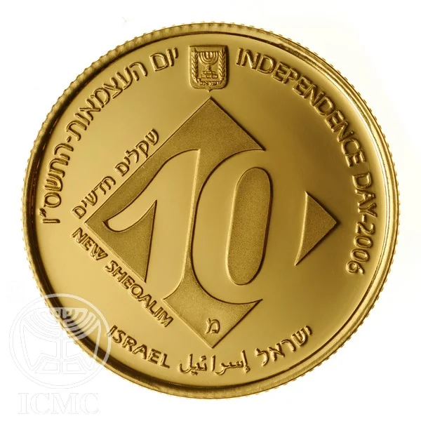 Face value in Hebrew and English, State emblem, "Israel" in three languages, and "INDEPENDENCE DAY 2006" along the border in Hebrew and English.