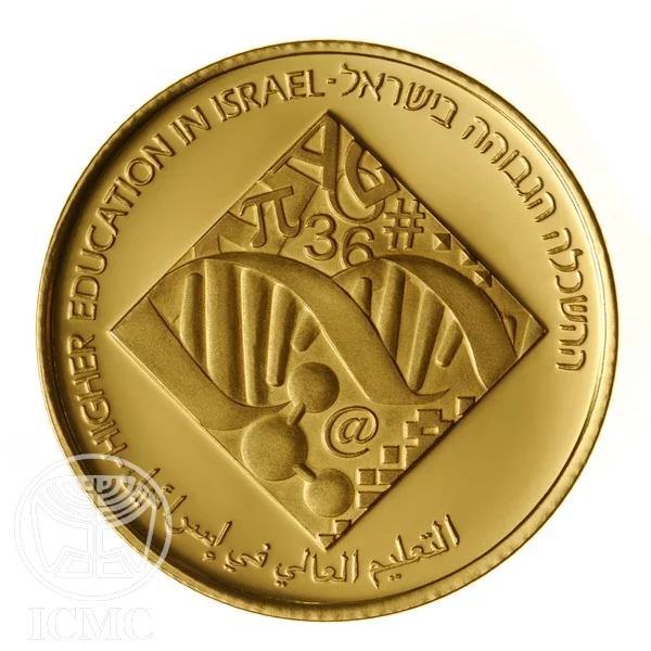 The coin features symbols from various academic disciplines combined into a world shaped like a graduation cap. The border reads "HIGHER EDUCATION IN ISRAEL" in Hebrew and English.