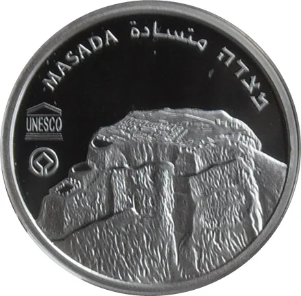 Masada's northern cliff with Herod's palace, UNESCO and World Heritage symbols, and "MASADA" inscribed in Hebrew, English, and Arabic.