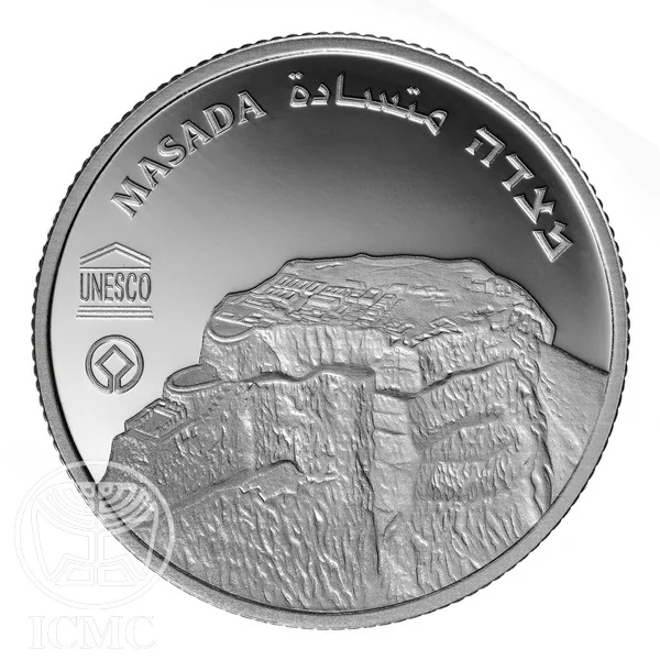 Masada's northern cliff with Herod's palace, UNESCO and World Heritage symbols, and "MASADA" inscribed in Hebrew, English, and Arabic.