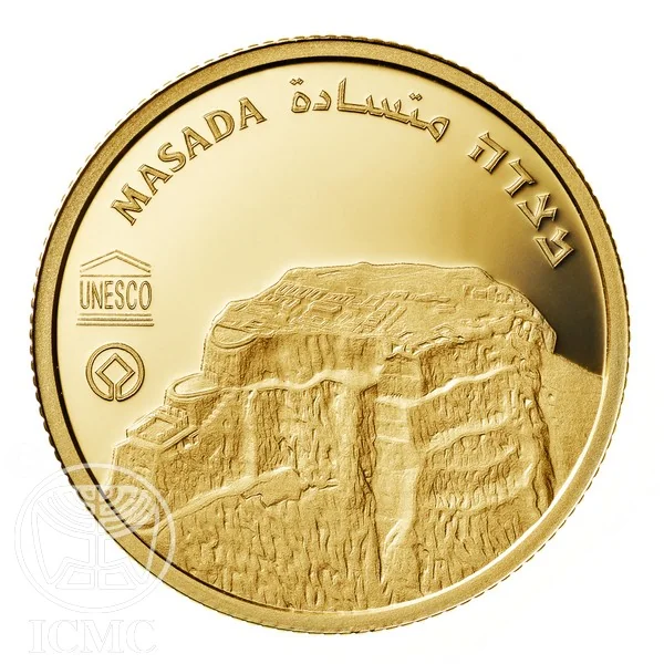 Masada's northern cliff with Herod's palace, UNESCO and World Heritage symbols, and "MASADA" inscribed in Hebrew, English, and Arabic.
