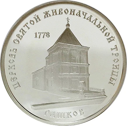 Description: The Church of the Holy Trinity in Rashkov, built in 1778. Cyrillic inscriptions encircle the image: the church's name at the top and "Rashkov" at the bottom.