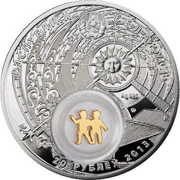 Description: Obverse: Belarus' State Coat of Arms above; center features an engraving fragment from A. Kircher's "Ars Magna Lucis et Umbrae"; right side shows alloy standard and Mint of Poland trademark. Circumferential inscriptions: "THE REPUBLIC OF BELARUS" above, denomination "20 RUBLES" and year below.