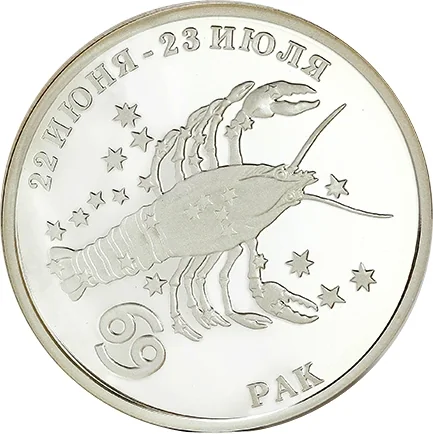 "22 ИЮНЯ - 23 ИЮЛЯ" is inscribed in a semicircle at the top. The center features a stylized Cancer zodiac symbol, with the Cyrillic "РАК" in a semicircle along the bottom edging.