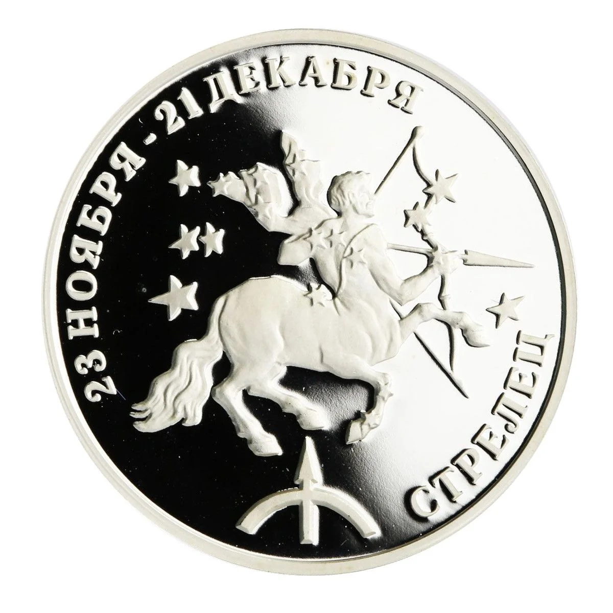 An inscription at the top reads "23 НОЯБРЯ - 21 ДЕКАБРЯ". The centre features a stylized Sagittarius symbol. Along the bottom edging, a semicircular inscription reads "СТРЕЛЕЦ".