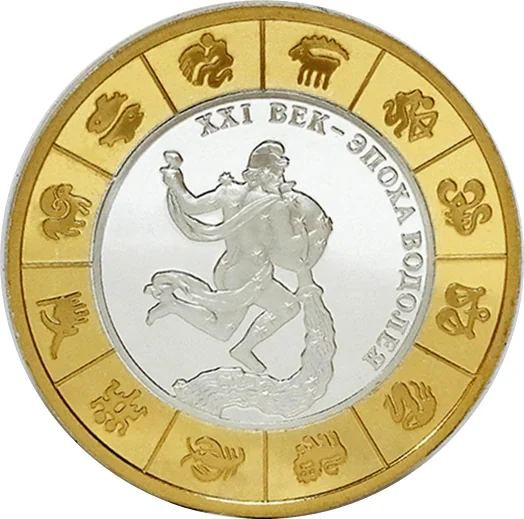 Description: Close-up of the «Epoch Aquarius» medallion, featuring the twelve zodiac signs in gold (0.1255 g pure). Inscribed above: "ЭПОХА ВОДОЛЕЯ" (EPOCH AQUARIUS), below: "XXI ВЕК" (XXI CENTURY).