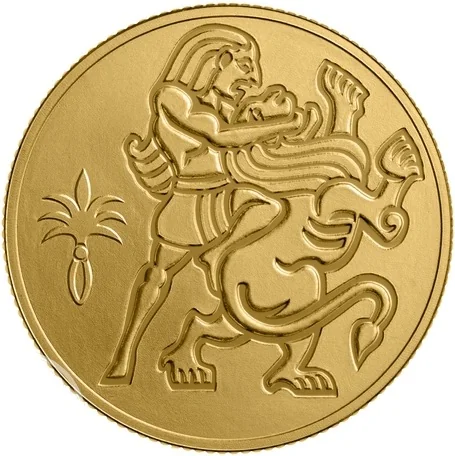 This coin features Samson wrestling a lion in Timnat, rendered in Canaanite Mesopotamian style, with a stylized palm tree symbolizing the Land of Israel.