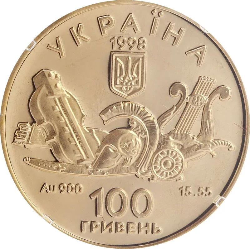 Description: The Small State Emblem of Ukraine is depicted, encircled by antique and Cossack attributes: two lyres, a helmet, sabre, flask, and a quiver with arrows. Inscriptions: УКРАЇНА and 1998 (above); 100 ГРИВЕНЬ, Au 900, metal designation, and 15,55 pure weight (below, in two lines).