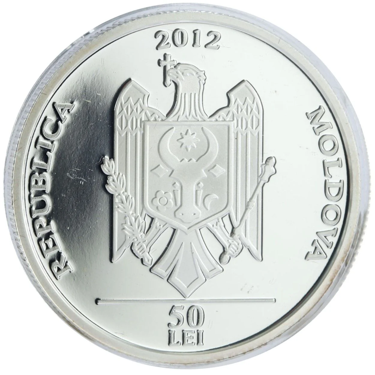 Central: Coat of Arms of Moldova. Top: year "2012". Bottom: "50 LEI". Circumference: "REPUBLICA MOLDOVA" in block letters.