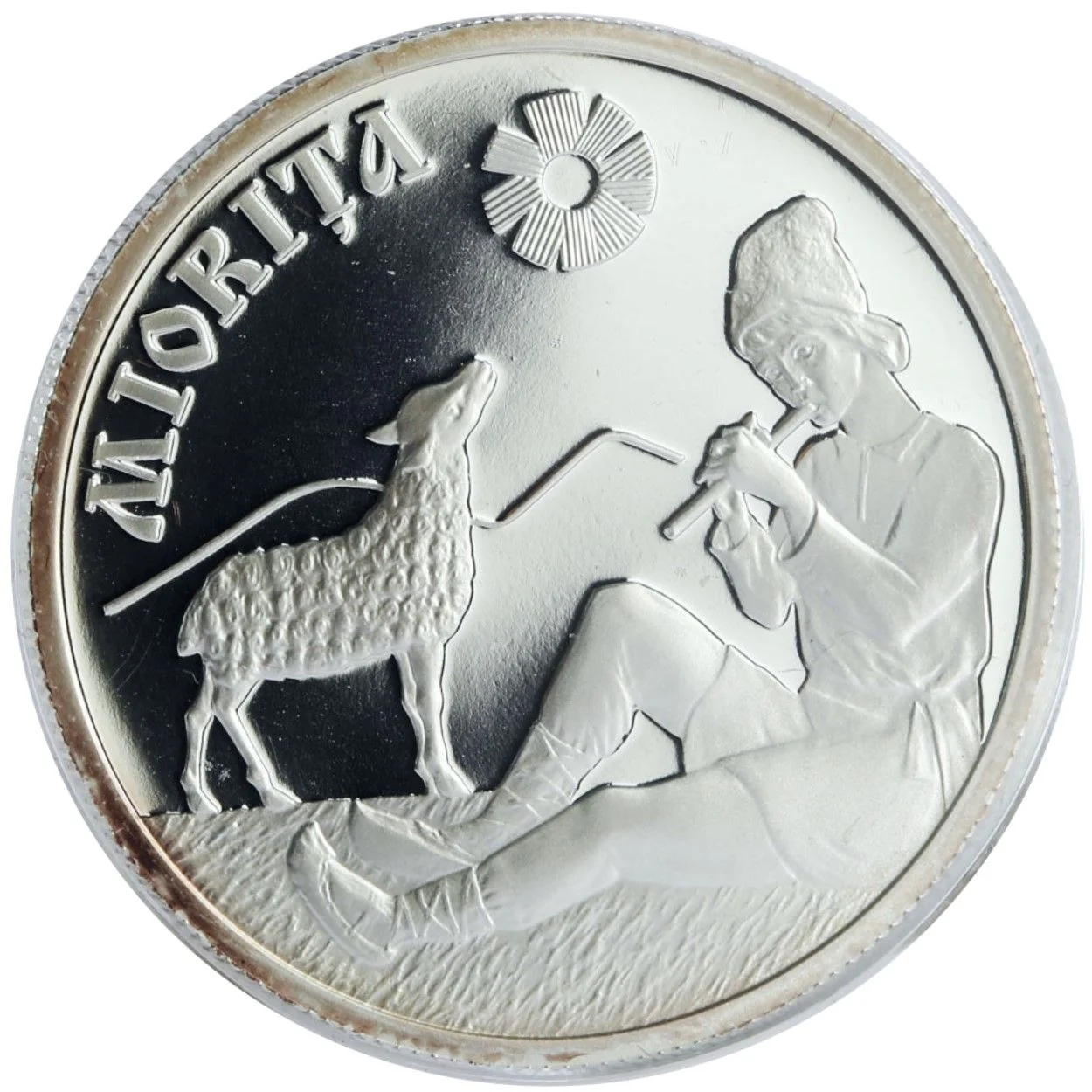 Center: a shepherd and ewe lamb. Top: the engraved block letters "MIORIŢA" and a stylized Sun.