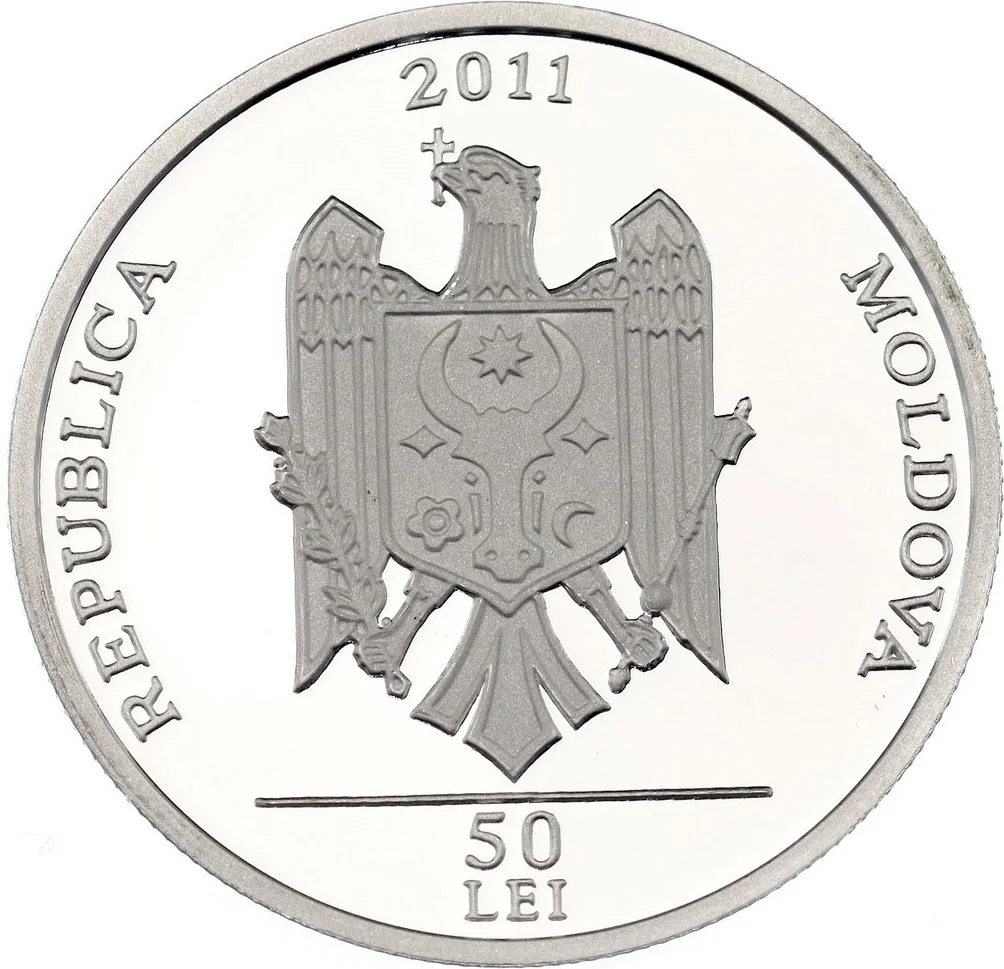 Central: Coat of Arms of Moldova. Top: year "2011". Bottom: "50 LEI". Circumference: "REPUBLICA MOLDOVA" in block letters.