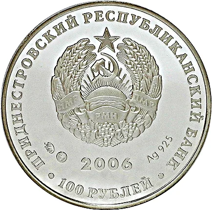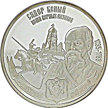 Description: A close-up portrait of Ataman Sidor Beliy (1735-1788) against a watchtower and a mounted Cossack. Circling inscriptions name him and his "Kosha of Faithful Cossacks." Below, a ribbon reads "Transdniester region, Cossacks’ land," centered on the Army's emblem dated 1787.