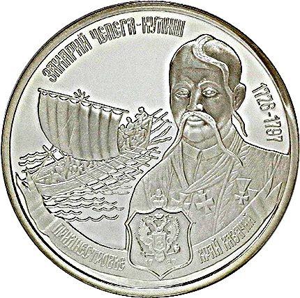 Description: A close-up portrait of Zakhariy Chepega-Kulish (1726-1797), ataman of the Black Sea Cossack Army, set before a sailing boat with oarsmen. Cyrillic text above names him. Below, a ribbon reads "Transdniester region, Cossacks’ land" and features the Army's emblem with the year "1787."