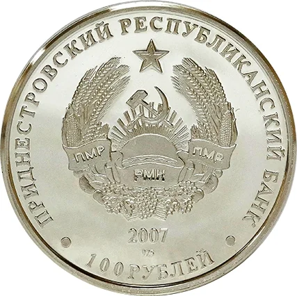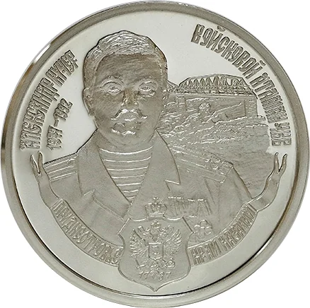Description: The portrait shows Alexander Kusher (1947-1992), Ataman of the Black Sea Cossack Army, against the backdrop of the Bendery bridge over the Dniester River. Flanking the portrait are his name and title. Below, a stylized ribbon bears the inscription "Transdniester region, Cossacks’ land" and the emblem of the Black Sea Cossack Army, founded in 1787.