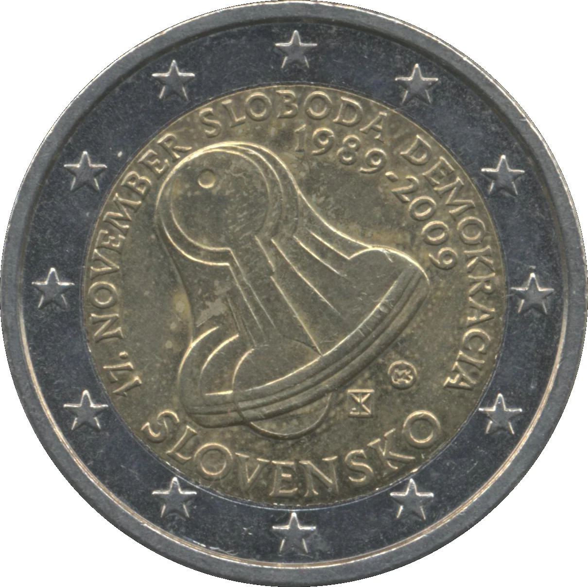 This coin depicts a stylized bell with keys as clappers, commemorating the key-jangling protests of 17 November 1989 that began Czechoslovakia's Velvet Revolution. Below the bell are the artist's and mint marks (Mincovňa Kremnica). Encircling it are the inscriptions '17. NOVEMBER SLOBODA DEMOKRACIA', '1989-2009', and 'SLOVENSKO'. The outer ring features the 12 stars of the European Union.