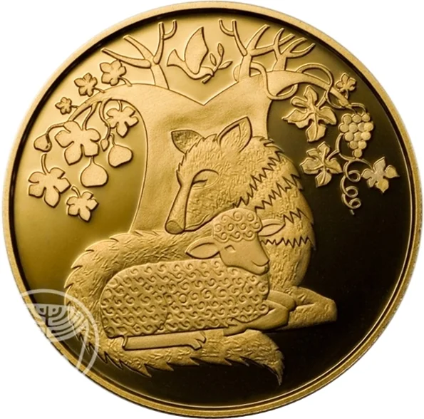 Face value in Hebrew and English, State emblem, "Israel" in three languages, and mint year. A dove with an olive branch appears above the verse "And the wolf shall dwell with the lamb Isaiah 11:6" in Hebrew and English.