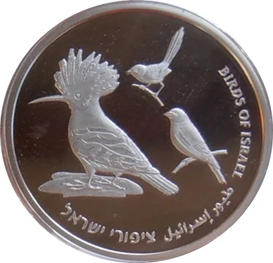 Top three in Israel's national bird competition: the winning Hoopoe with runner-ups Warbler and Finch; "Birds of Israel" inscribed in Hebrew, English, and Arabic.