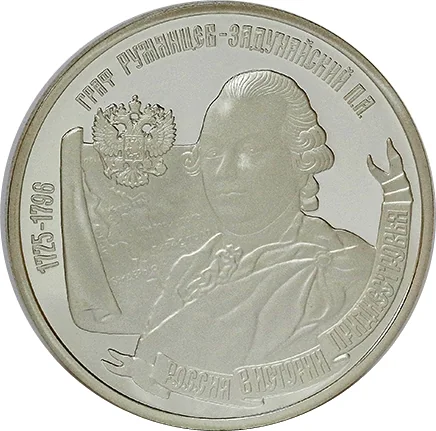 Description: Right foreground: a portrait of Count P.A. Rumiantsev-Zadunaisky. Left background: a map of the Transnistria region, above it the Russian Empire emblem. Along the top edging: a circling inscription "граф РУМЯНЦЕВ-ЗАДУНАЙСКИЙ П.А.". Along the bottom edging on a ribbon: "РОССИЯ В ИСТОРИИ ПРИДНЕСТРОВЬЯ". To the left of the portrait along the edging: his life years “1725 - 1796”.