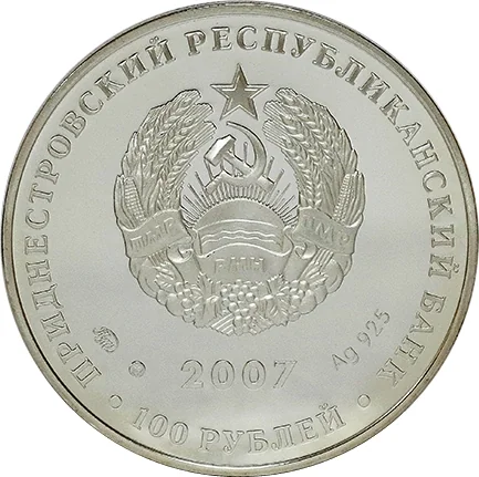 Description: The center features General-in-Chief P.I. Panin in military uniform, with the Bendery fortress and its coat of arms. Encircling inscriptions note his name and lifespan (1721–1789), and the phrase "Russia in the history of Trans-Dniester region" on a stylized ribbon along the bottom edge.