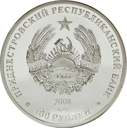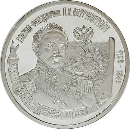 Description: The center features Field Marshal Piotr Vitgenshtain. Behind him are attacking Russian troops and the Russian Empire's coat of arms. Above, a circular inscription reads: "ГЕНЕРАЛ-ФЕЛЬДМАРШАЛ П. Х. ВИТГЕНШТЕЙН." At left are his life dates: "1768-1843." Below, along the edge on a stylized ribbon, is the inscription: "РОССИЯ В ИСТОРИИ ПРИДНЕСТРОВЬЯ."