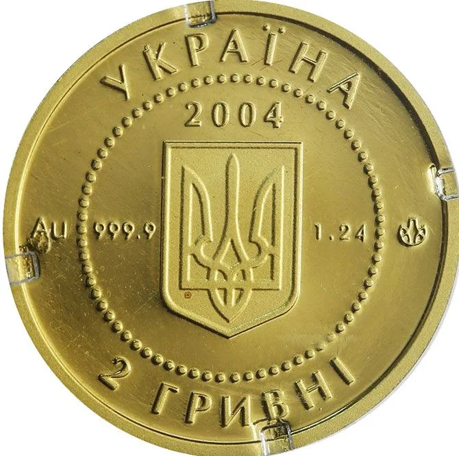 A string of beads encircles Ukraine's national emblem and the year 2004. Between this circle and the coin's rim are the inscriptions УКРАЇНА (above) and 2 ГРИВНІ (below), along with the metal's specification and the Mint logo.