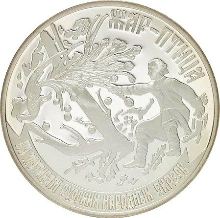 Description: Tsar Ivan's son holds the captured Fire-Bird before an apple tree. Cyrillic text labels "ЖАР-ПТИЦА" top right and "ПО МОТИВАМ РУССКИЙ НАРОДНЫХ СКАЗОК" along the lower left rim.