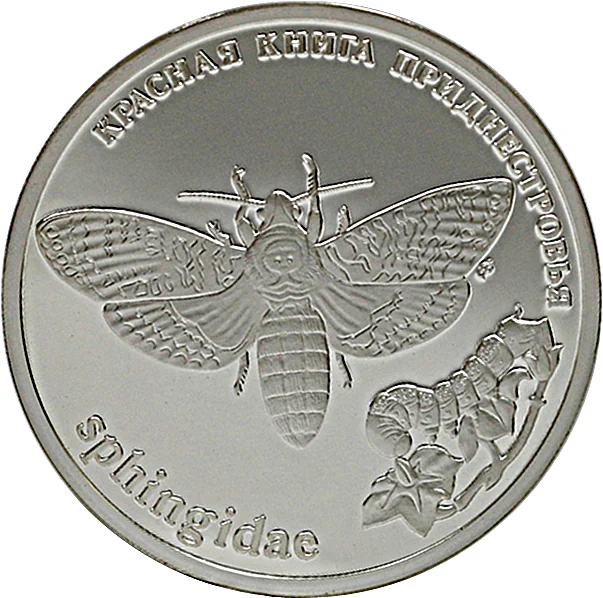 Description: Butterfly: Dead head. Right: flower and caterpillar. Top left: "КРАСНАЯ КНИГА ПРИДНЕСТРОВЬЯ" (THE RED BOOK TRANSDNIESTRIA). Below: "sphingidae".