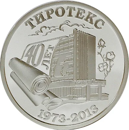 A close-up of the JSC "Tirotex" building, wrapped in a fabric tape reading "40 ЛЕТ". To its right is a cotton branch, with "ТИРОТЕКС" above and "1973-2013" below.