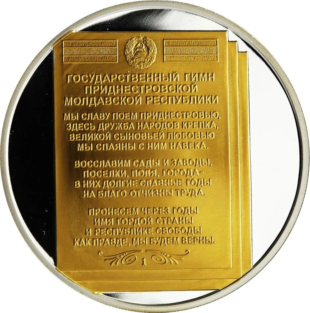 Description: The center pages are gilded. At the top is the State Emblem of the Pridnestrovskaia Moldavskaia Respublika, flanked by its flags. Below is an inscription, followed by the hymn's first verse and refrain. The page number is at the bottom.
