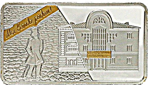 Description: Centered: the Savings Bank building, past and present, with the gilded inscription "СБЕРЕГАТЕЛЬНЫЙ БАНК". Left: a figure walking on stone blocks toward the bank, above the gilded inscription "МЫ ВСЕГДА РЯДОМ".