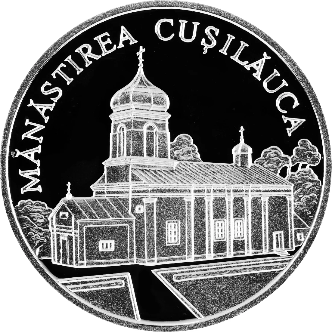 - Around the upper edge, the inscription "MĂNĂSTIREA CUŞILĂUCA" is engraved in block letters.