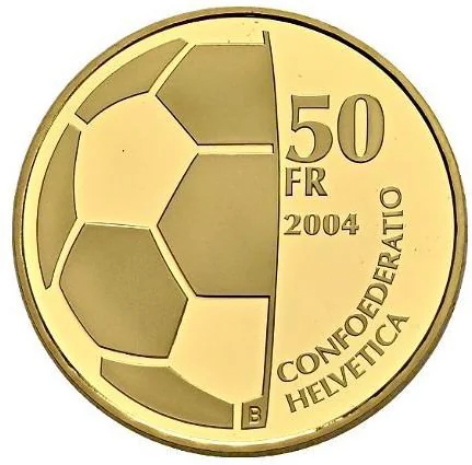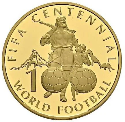 William Tell walking forward with crossbow on shoulder, arm around child. Mountain backdrop. "100" with soccer ball zeros.