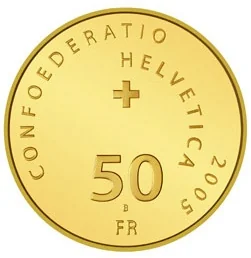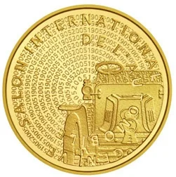 Partial front view of a vintage car. "19052005" repeated in concentric circles across the coin. Engraver's name at top left.