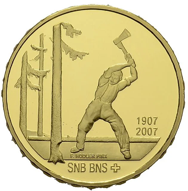 Ferdinand Hodler's 1908 "The Woodcutter" depicts a man swinging an axe overhead to fell a fir tree.
