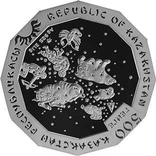 The central design features mythological constellation symbols and the inscription "Ag 925 31.1 gr." A wide matted border encircles the coin, bearing the sunken inscriptions "500 ТЕҢГЕ", "ҚАЗАҚСТАН РЕСПУБЛИКАСЫ", "REPUBLIC OF KAZAKHSTAN", and a stylized sun.