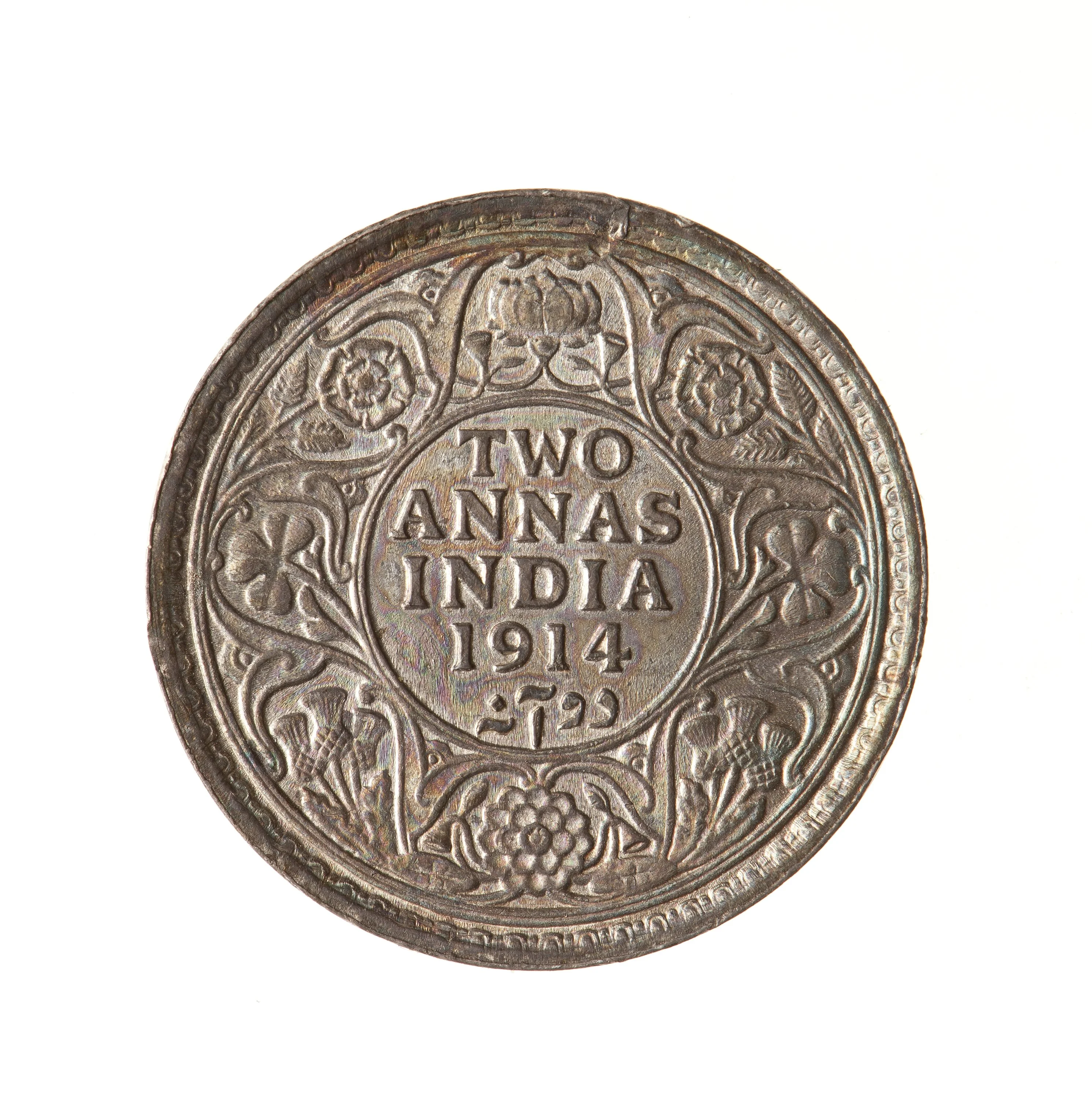 Inside, the date separates English and Urdu (“Do Aana”) text. Outside, a wreath of roses, thistle, shamrock, and lotus encircles this, all within a toothed border.