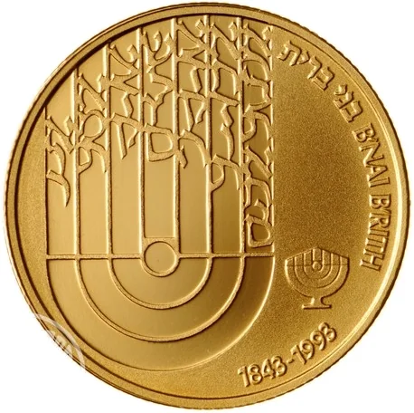 The emblem features a menorah with the seven Hebrew principles of B'nai B'rith. To its right is a smaller menorah above the years "1843-1993." The right border is inscribed with "B'NAI B'RITH" in English and Hebrew.