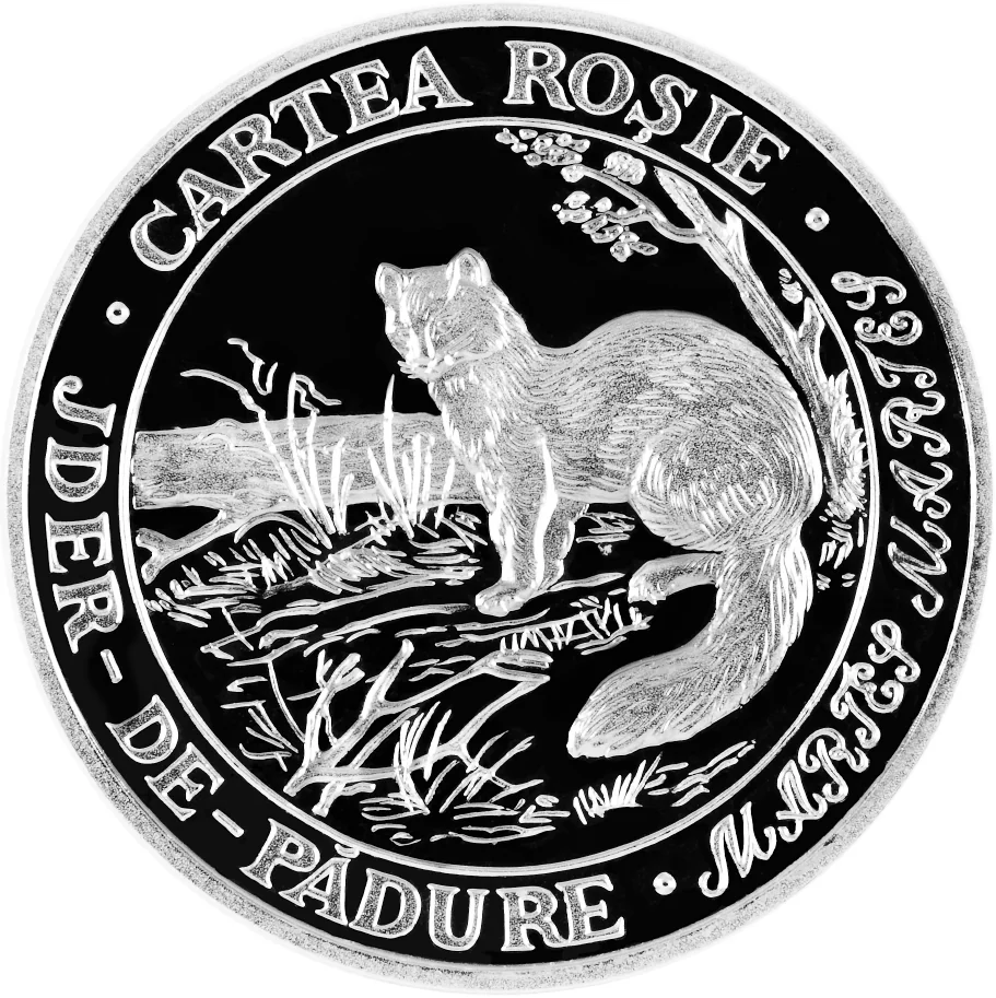 Description: Center: a marten on a vegetal background. Circumference: block letters reading "CARTEA ROŞIE", "JDER-DE-PĂDURE", "MARTES MARTES".