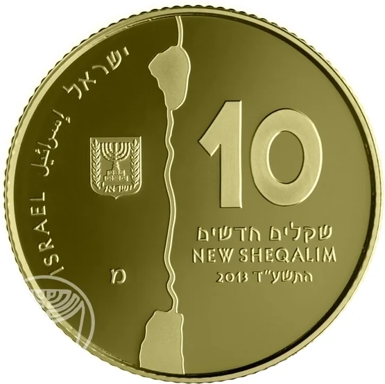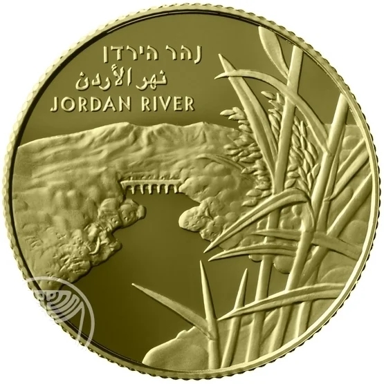 Face value, state emblem, "Israel" in three languages, mint year and mark, and the Jordan River flowing from the Sea of Galilee to the Dead Sea.