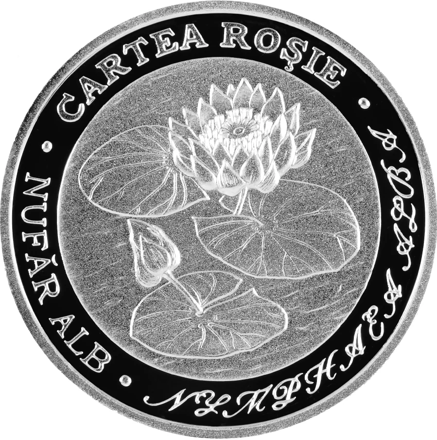 Description: Central: white water lily on a vegetal background. Circumference: block letter inscriptions "CARTEA ROȘIE", "NUFĂR ALB", "NYMPHAEA ALBA".