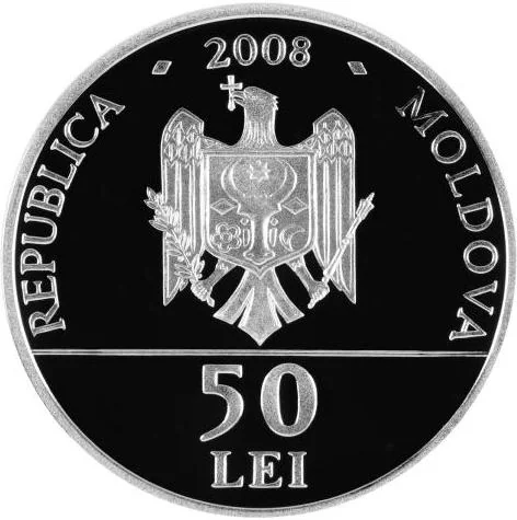 Central: Coat of Arms. Top: "2008". Bottom: "50 LEI". Circumference: "REPUBLICA MOLDOVA" in block letters.
