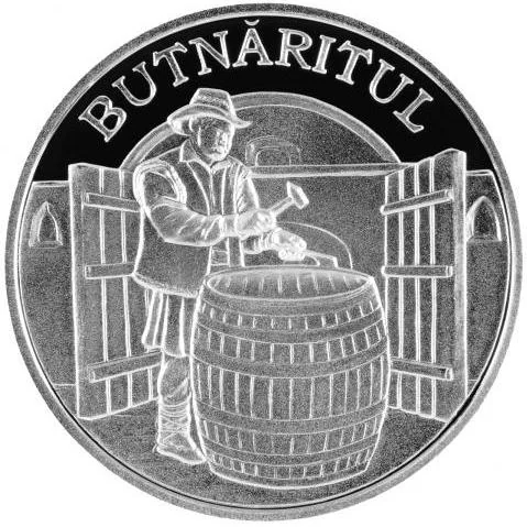 Center: a cooper making a barrel. Above, following the coin's edge: the inscription "BUTNĂRITUL" in block letters.
