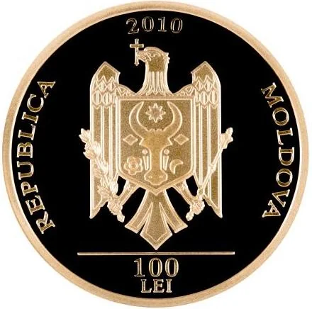 Central: Coat of Arms of Moldova. Top: year "2010". Bottom: "100 LEI". Circumference: block letters "REPUBLICA MOLDOVA".