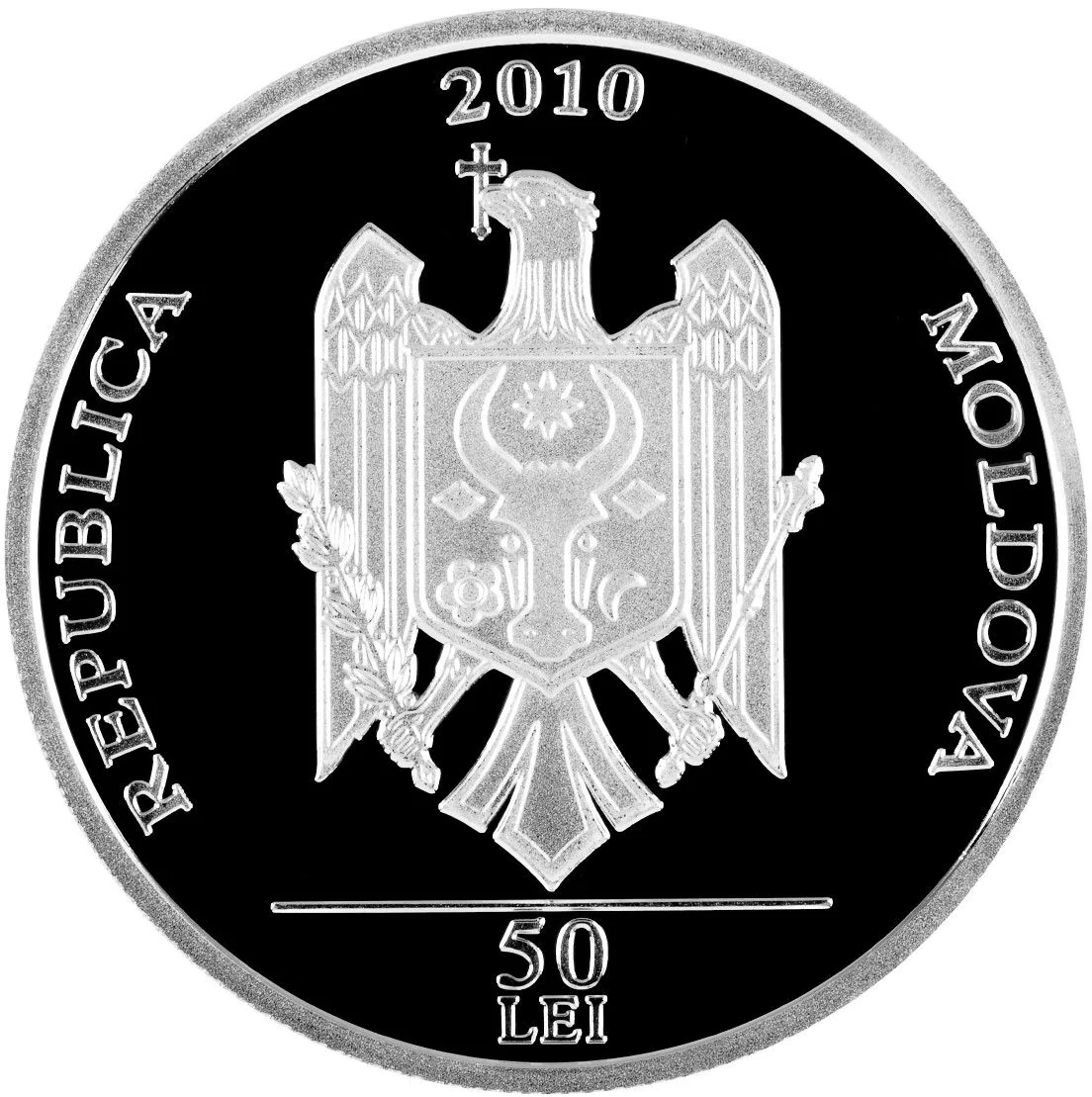 Central: Coat of Arms of Moldova. Top: year "2010". Bottom: denomination "50 LEI". Circumference: "REPUBLICA MOLDOVA" in block letters.