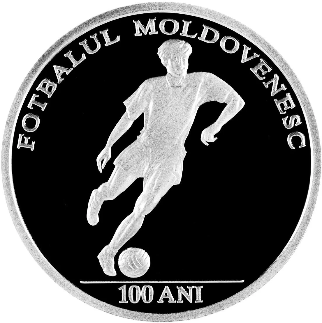 A central image of a footballer with a ball at his foot; above, "FOTBALUL MOLDOVENESC" in block letters; below, "100 ANI" in block letters.