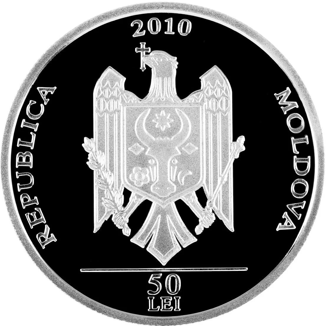 Central: Coat of Arms of Moldova. Top: year "2010". Bottom: denomination "50 LEI". Circumference: "REPUBLICA MOLDOVA" in block letters.